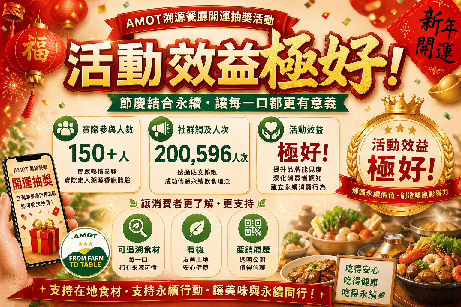 於新年期間,AMOT推出「溯源餐廳開運抽獎」活動,結合節慶氛圍與飲食教育,邀請消費者在團聚用餐之餘,也能關注食材來源與永續價值。活動機制以「至溯源餐廳消費滿額即可參加抽獎」為主,透過簡單參與方式降低門檻,鼓勵民眾實際走入各溯源餐廳門市體驗透明可追溯的飲食模式。